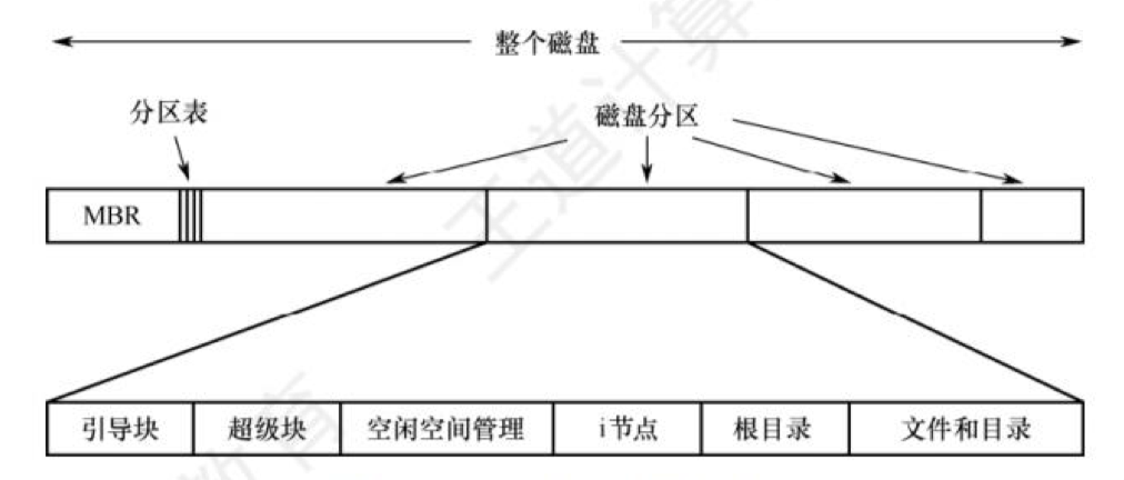 我们可以将一个磁盘划分为多个分区,每个分区中有一个文件系统。下图是一个可能的文件系统布局: